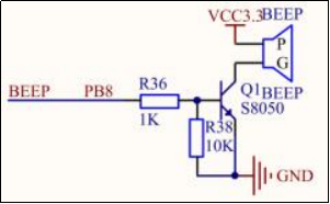 我们用一个 NPN 三极管(S8050)来驱动蜂鸣器,驱动信号通过 R36 和 R38 间的电压获 得,芯片上电时默认电平为低电平,故上电时蜂鸣器不会直接响起。当 PB8 输出高电平的时候, 蜂鸣器将发声,当 PB8 输出低电平的时候,蜂鸣器停止发声。
