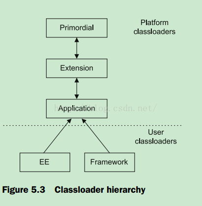 The platform ships with a number of typical classloaders, which are used to do different jobs during the startup and normal operation of the platform:■Primordial (or bootstrap) classloader—This is instantiated very early in the process