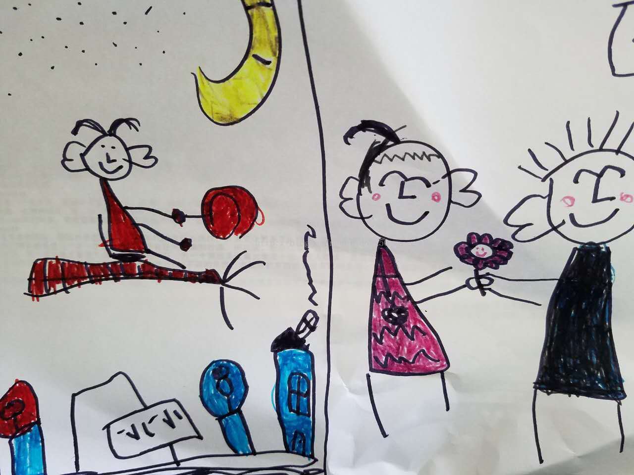 在我写这些字的时候,小小玩够了数学,自己画了一幅画,在大众眼里,一个5岁的孩子画成这样,画的不像,但是在我看来,画得很好,有自己的思想,没有临摹,就是成功: