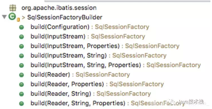对于builder的具体类,方法都大都用build*开头,比如SqlSessionFactoryBuilder为例,它包含以下方法: