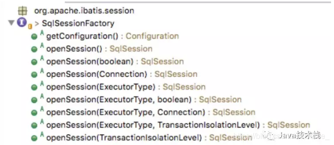 可以看到,该Factory的openSession方法重载了很多个,分别支持autoCommit、Executor、Transaction等参数的输入,来构建核心的SqlSession对象。