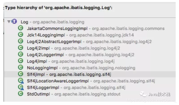 该接口定义了Mybatis直接使用的日志方法,而Log接口具体由谁来实现呢?Mybatis提供了多种日志框架的实现,这些实现都匹配这个Log接口所定义的接口方法,最终实现了所有外部日志框架到Mybatis日志包的适配: