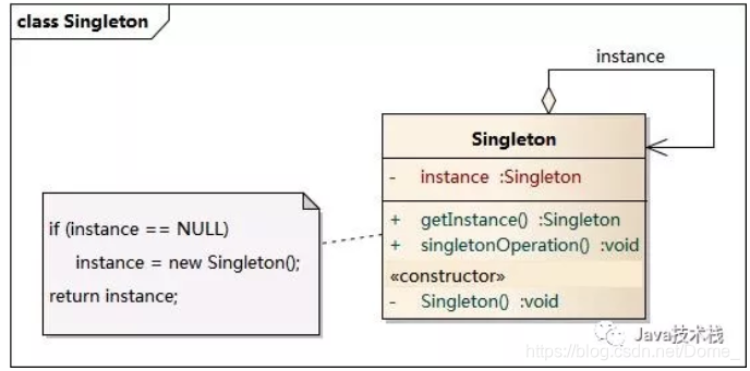 构造函数是private修饰,具有一个static的局部instance变量和一个获取instance变量的方法,在获取实例的方法中,先判断是否为空如果是的话就先创建,然后返回构造好的对象。