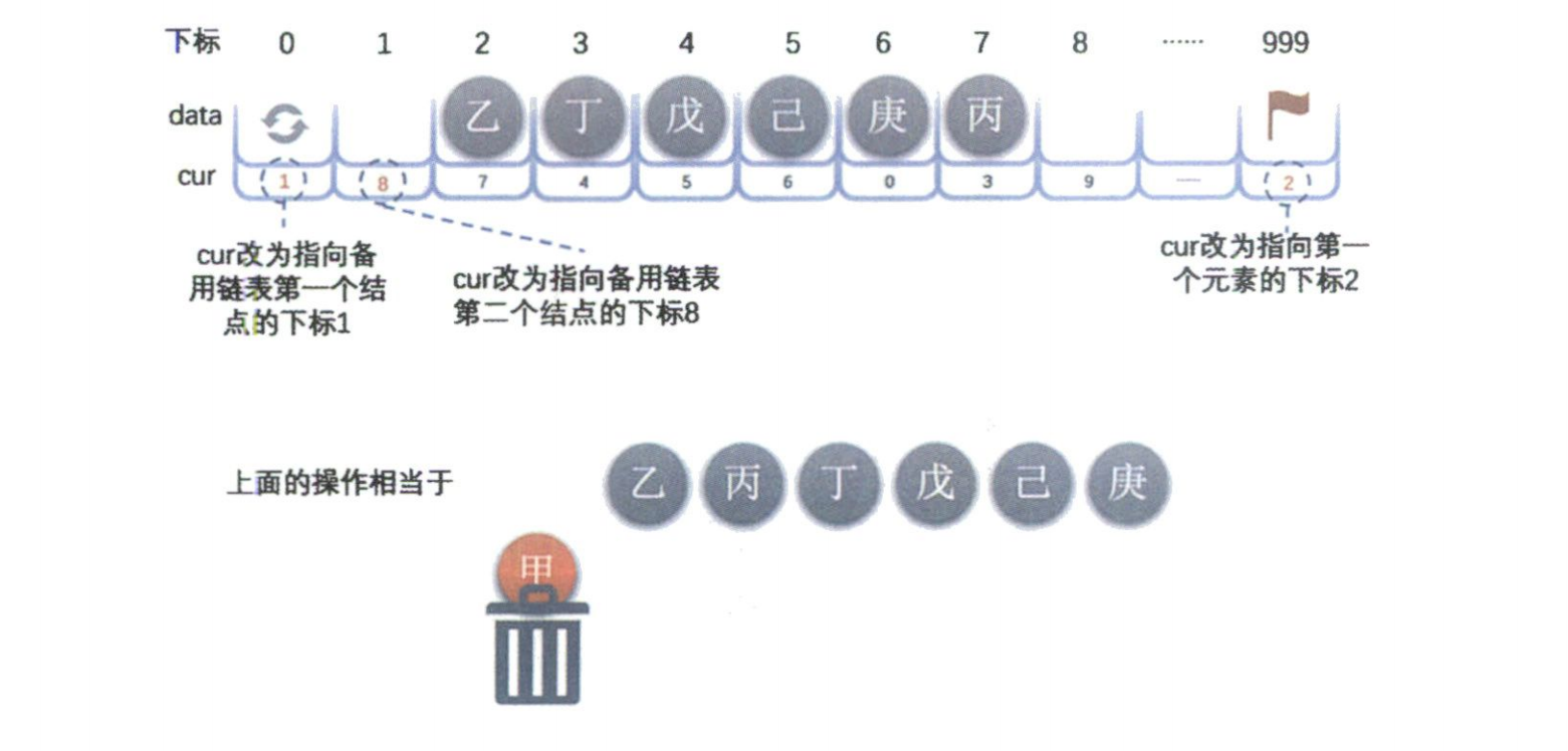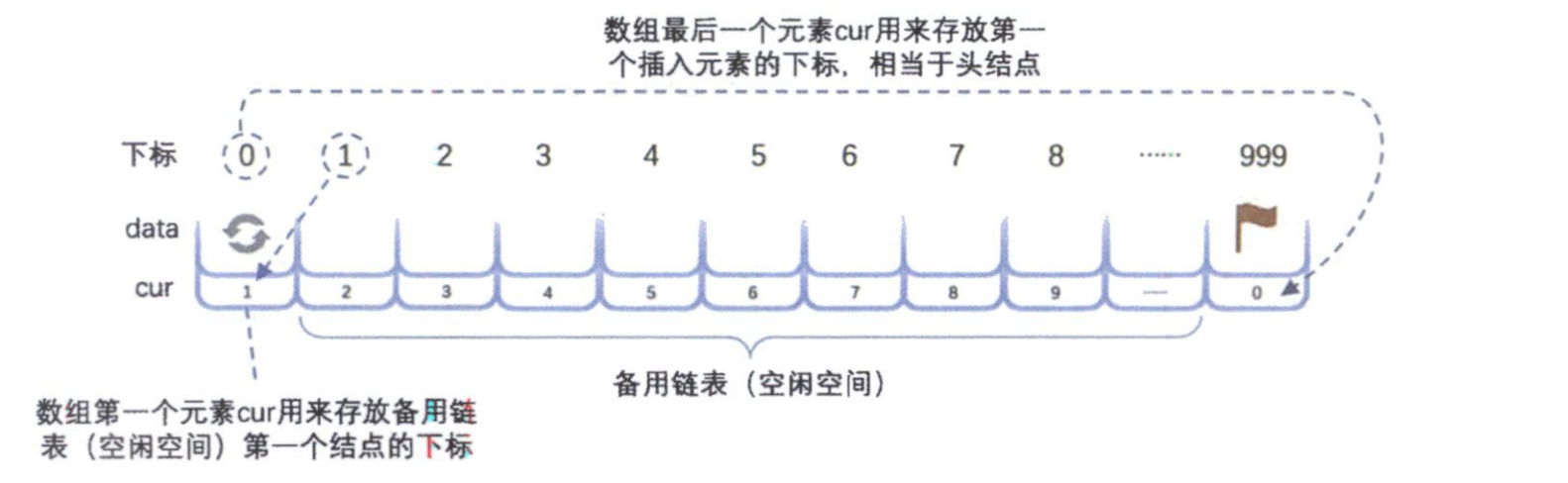 cur域被用来存放“备用链表”的第一个结点的下标。所谓备用链表,就是所有未被使用的、空闲的数组单元组成的链表。 - 数组最后一个元素 (下标