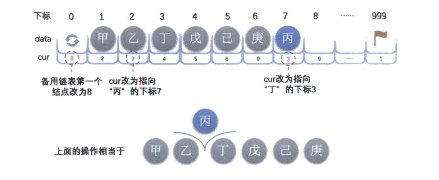这样,“乙”就被逻辑上删除了,其占用的空间也回到了备用链表中,等待下一次被分配。