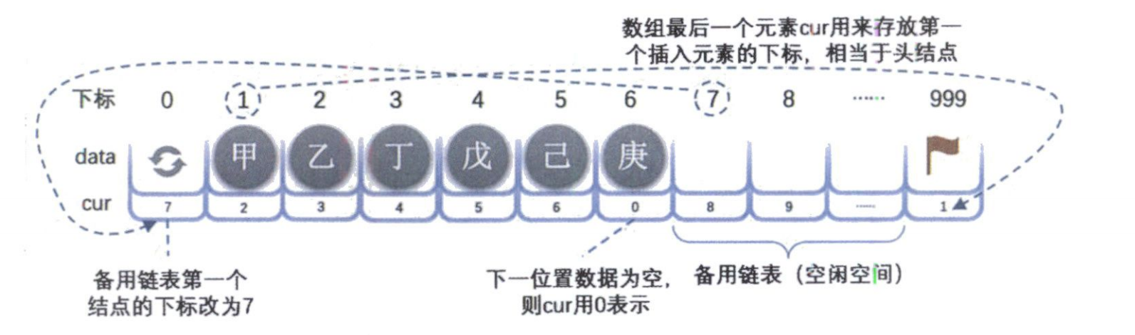 data: 存放实际的数据元素。cur: 存放后继元素在数组中的下标,我们称之为“游标”。