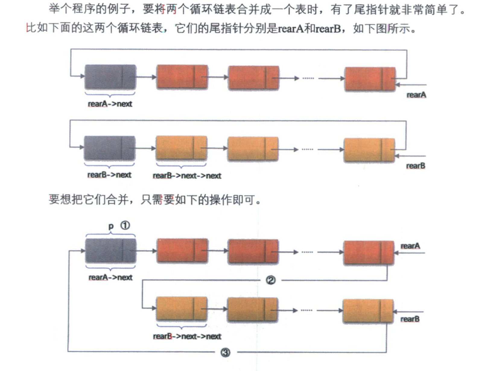 虽然循环链表解决了遍历问题,但在某些操作上仍有不足。例如,要合并两个循环链表,如果只有头指针,我们需要遍历整个链表才能找到各自的尾结点。