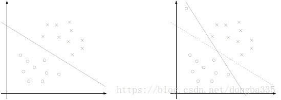 在前面的讨论中,我们一直假定训练样本在样本空间中是线性可分的,存在一个超平面能够把不同类的样本完全划分开。然而,在现实任务中往往是很难找到合适的核函数将训练样本“完全划分”。即使找到了某个核函数刚好将训练集在特征空间中线性可分,但是这种情况也有可能是过拟合造成的。由于噪声值的出现,超平面会有很大的倾斜,会得到一个间隔非常小的超平面,如下图所示。
