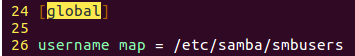 在global下添加一行字段username map = /etc/samba/smbusers开启用户帐号映射功能。