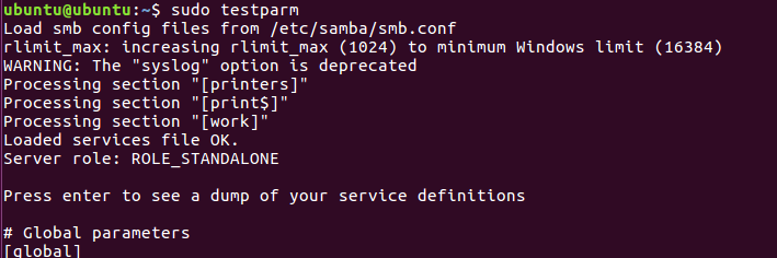 sudo testparm 验证一下配置参数有没有问题,如果有问题在回去修改