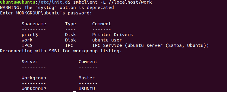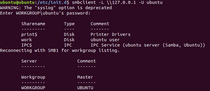 smbclient -L \\127.0.0.1 -U ubuntu //这时输入的密码就是刚才设置的samba密码