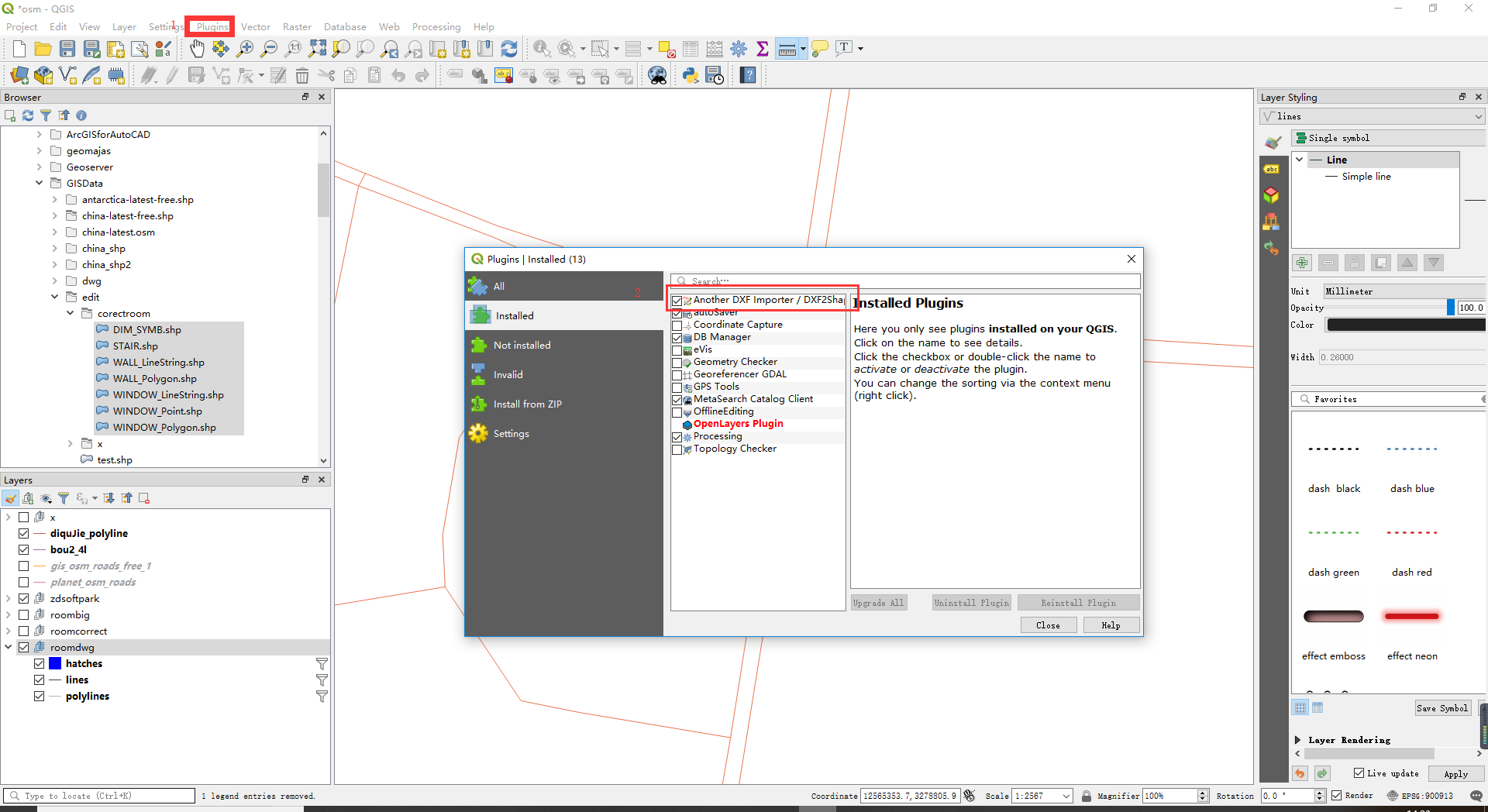 (2)添加插件DXF Importer /DXF2Shp。在plugins|installed 窗口中 搜索安装 该插件