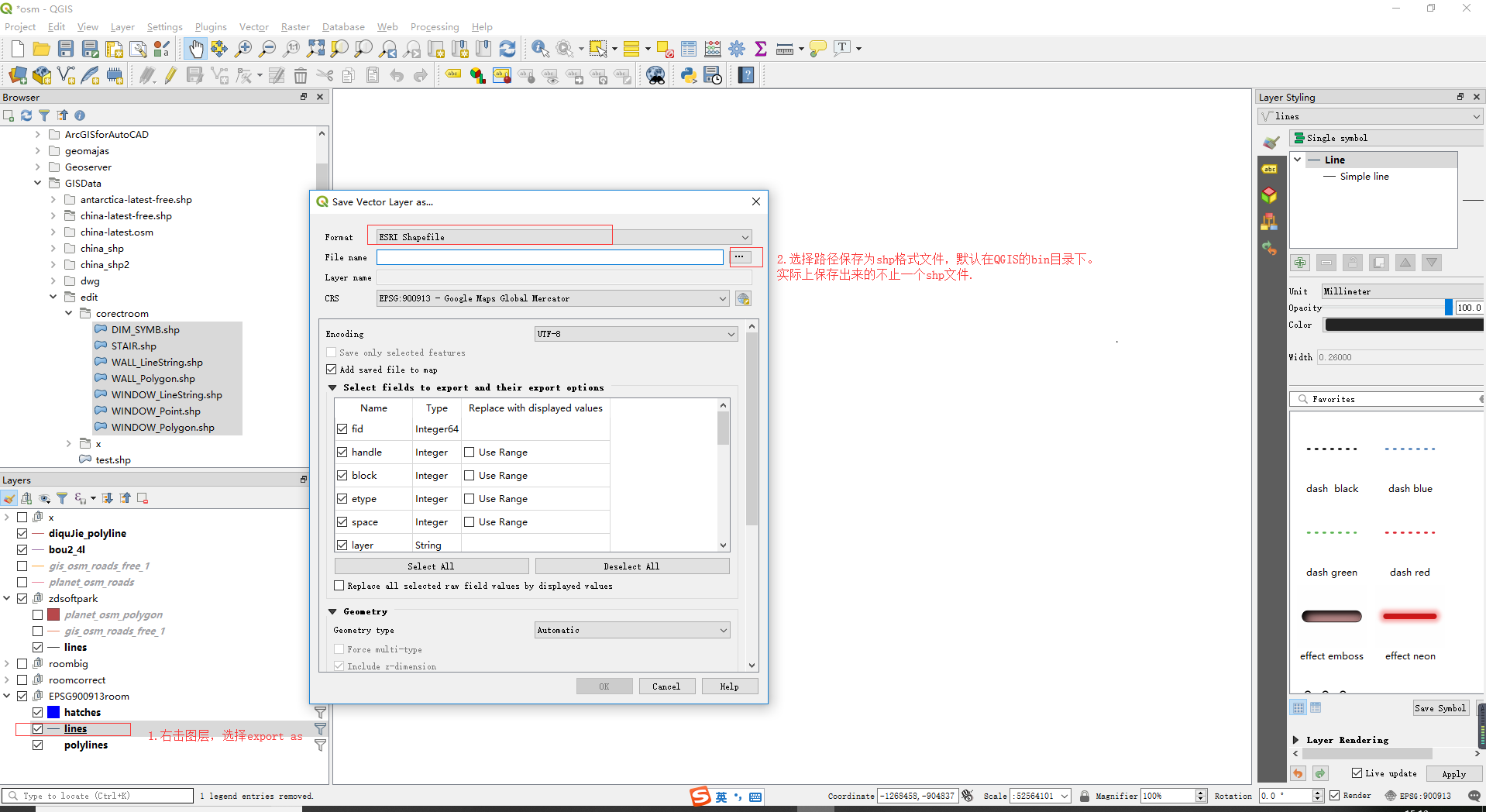 本博客采用的坐标系ESPG:900913(来自原有的shp文件,open street map导出的shp文件和osm文件采用的就是这一坐标系)