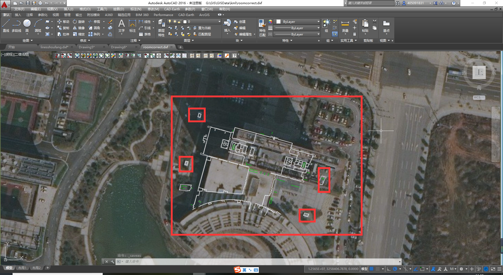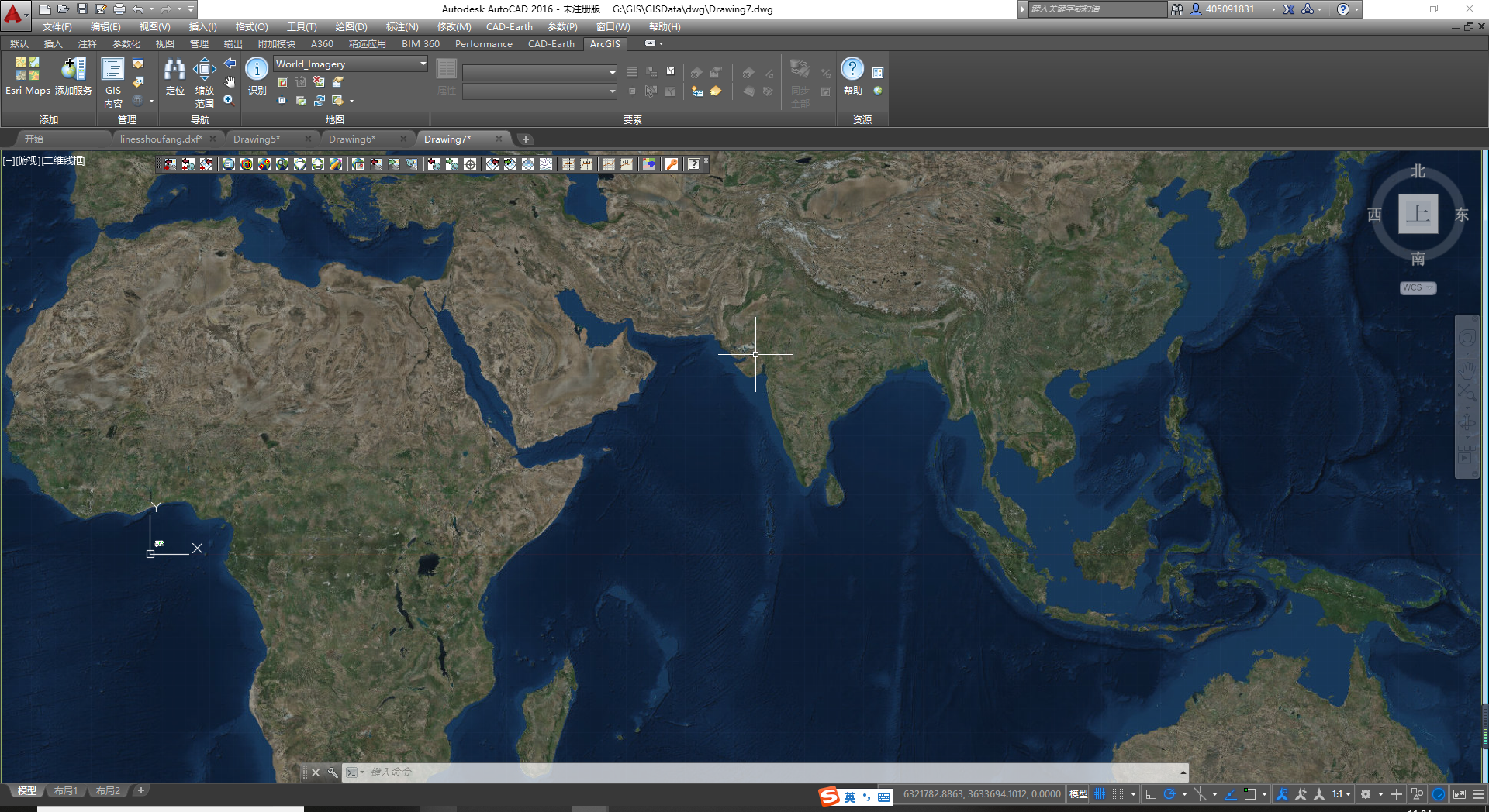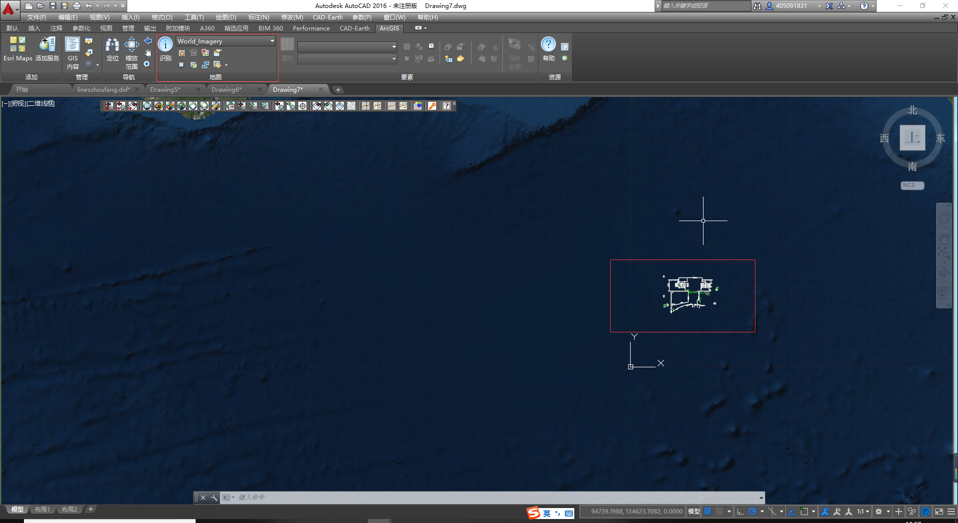 (5)地图导入后的效果,如果一开始看不到地图,就缩放地图。此时AutoCAD的坐标原点与之前选择的地理坐标原点重合。(ESPG:900913的坐标原点在非洲西部的大西洋中)
