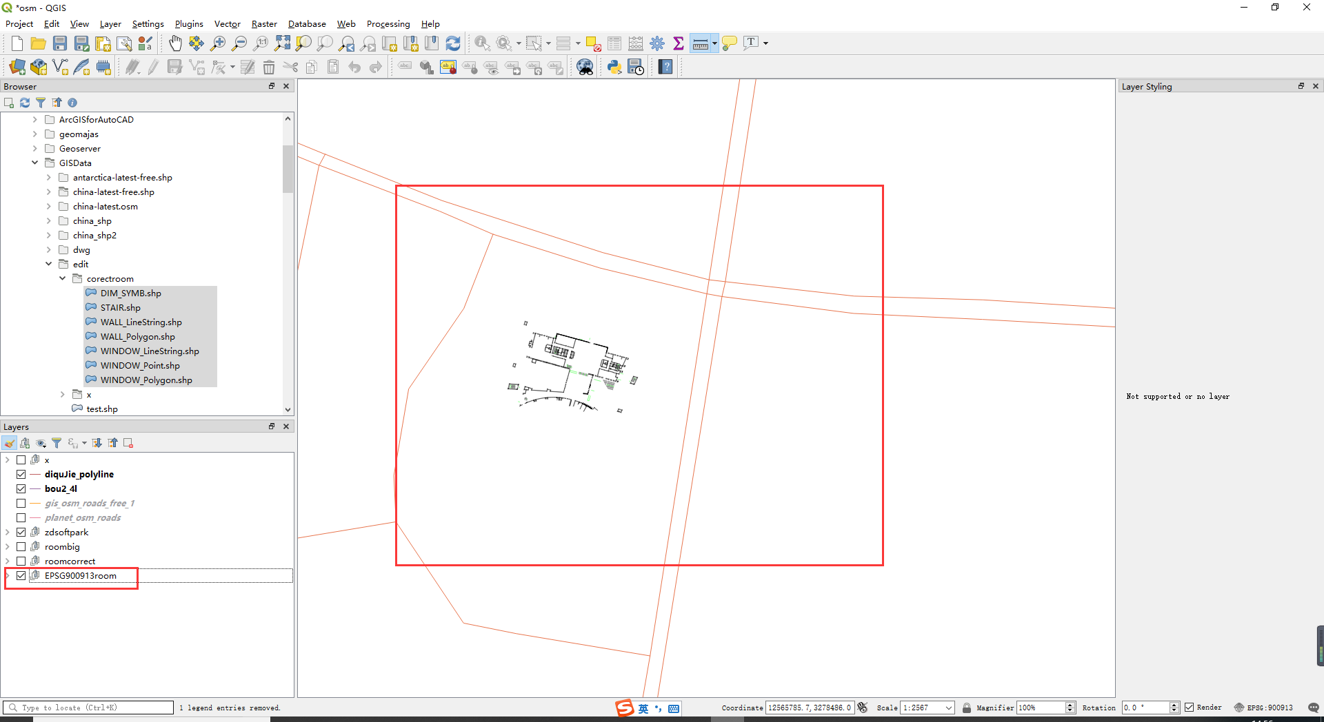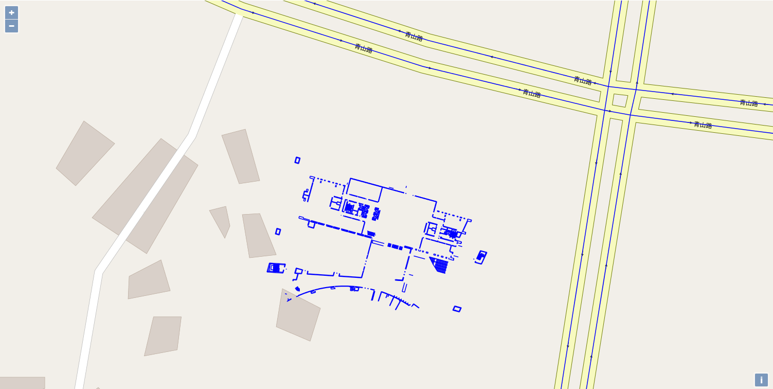 (1)显示结果。蓝色的线条为Geoserver服务提供的数据,我在Geoserver中导入了Open steet map的道路(OSM)数据 一并显示出来了,蓝色的小方块是dwg的文件内容