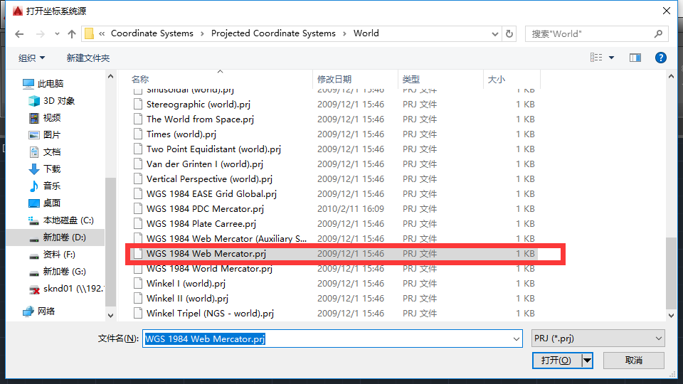 选择ArcGIS for AutoCAD安装目录 D:\Program Files\ArcGIS for AutoCAD 355\Coordinate Systems\Projected Coordinate Systems\World 下的WGS 1984 Web Mercator.prj