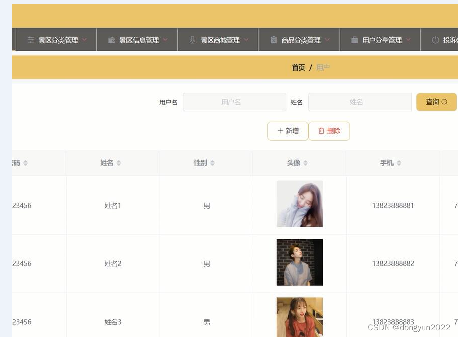 (1)管理员:用户管理、景区分类管理、景区信息管理、景区商城管理、商品分类管理、用户分享管理、投诉建议管理、系统管理、订单管理等