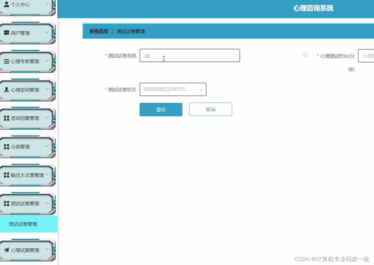心理咨询系统设计与实现课题主要的研究内容及要求如下: (1)能对患者信息进行维护; (2)能对心理医生信息进行维护; (3)能管理患者的病历信息; (4)能进行心理测试,能通过该系统组合出一套心理测试问卷,让患者进行自动测试,并给出一定结论; (5)与医生进行在线交流; (6)实现简易机器人自动问答系统,机器人自动提出心理问题,患者进行回答,最终给出结论。 (7)其他按照实际需求