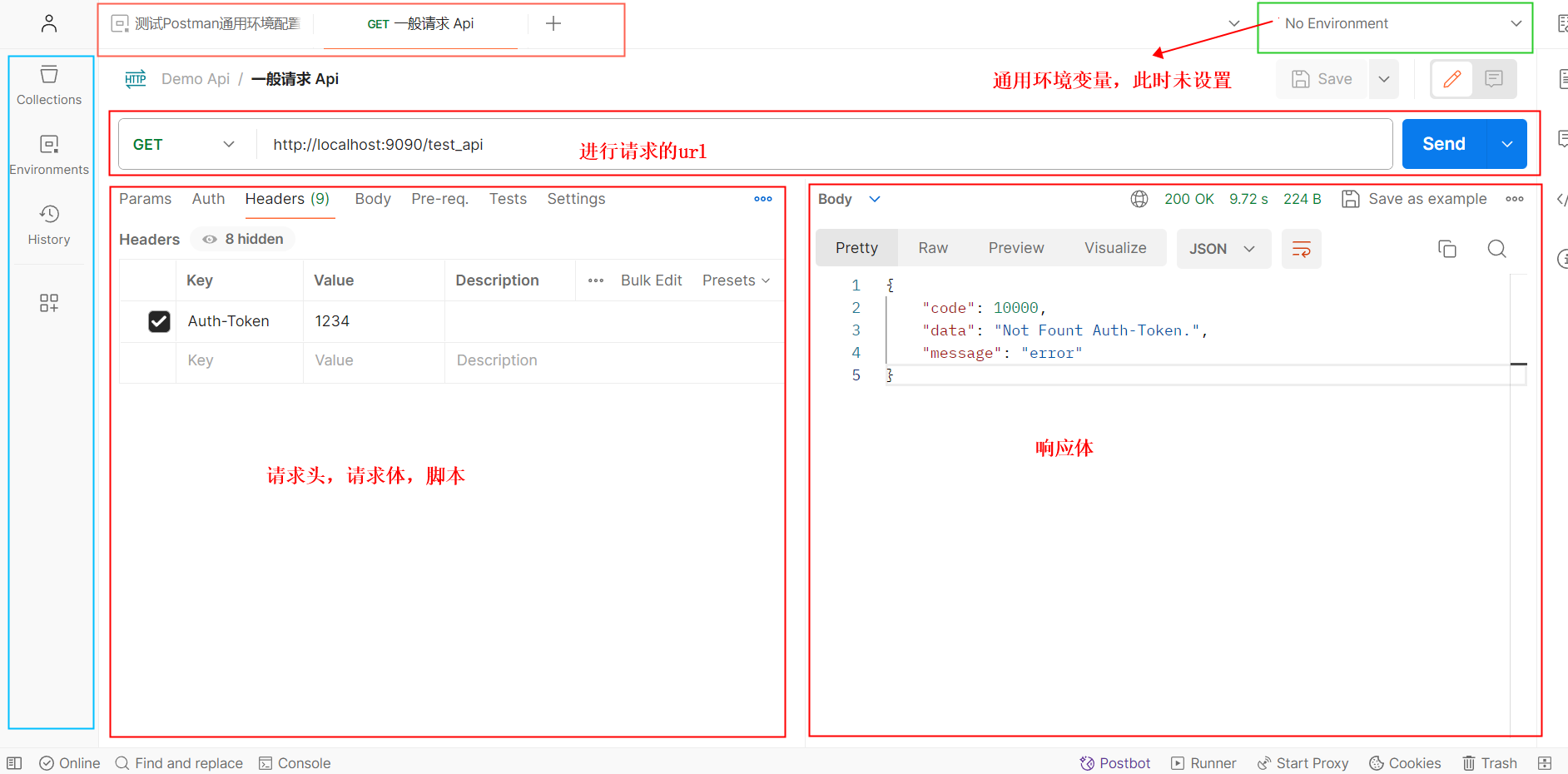 Postman基本使用、测试环境(Environment)配置 一般在使用的时候,会把整个完整的请求url写到地址栏,包括协议、域名、端口号、项目地址。在单一环境进行请求的时候,这样写不会出现大范围重新编辑的情况,通常复制链接就能把协议、域名、端口等全部复制到新url。只需要重新修改项目地址即可!也可能会出现问题:一旦出现直接同时测试线上(某个域名下的Api)或者测试本地(localhost)下的Api,就可能出现反复修改域名的情况,这样就是让原本简单的请求变的复杂,修改的请求少了还好,改的多了之后会很让人头大。如果你说这个也不复杂呀?