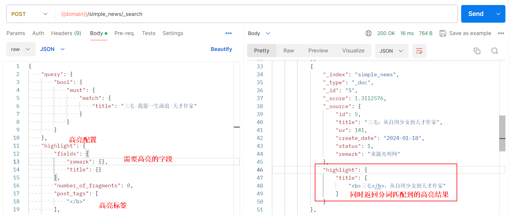ES6.8.6 创建索引配置分词器、映射字段指定分词器、查询数据高亮显示分词结果(内置分词器、icu、ik、pinyin分词器) 通过拼音同样能查询到es中的中文记录,但是,pinyin分词对高亮结果的返回可能不太支持,全部都是空标签。(略)数据内容同上,除索引名称、分词器不一样外,其他一样。(略)数据内容同上,除索引名称、分词器不一样外,其他一样。观察高亮标签,对比icu分词器查询的结果更多了。的数据,和原本应该查的关系关联度是非常低的。参考对输入的分词,以同样的步骤,对。以下postman截图中{{domain}}等于。通过icu分词器的分词查询,也进行了高亮,说明通过天才作家匹配到了记录。对词的拆分粒度更大。