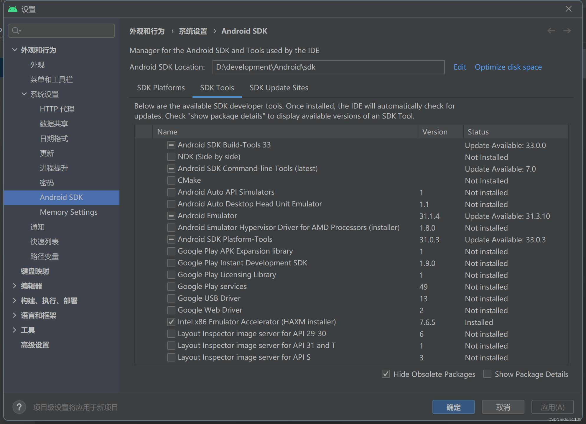 在SDK Tools里面,选择安装必要组件:Android模拟器、SDK Platform Tools和虚拟机加速,选择好之后点击安装