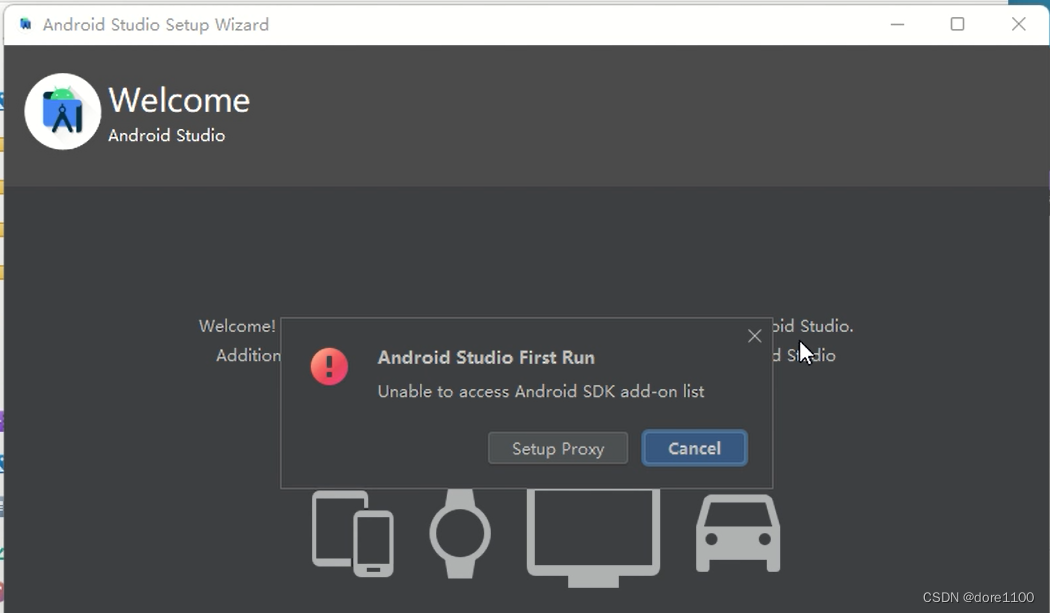 安装完成第一次启动Android studio会弹出弹框,提示我们是否设置代理,直接取消