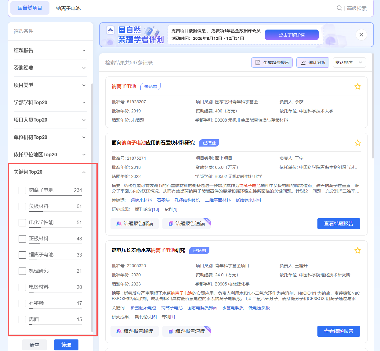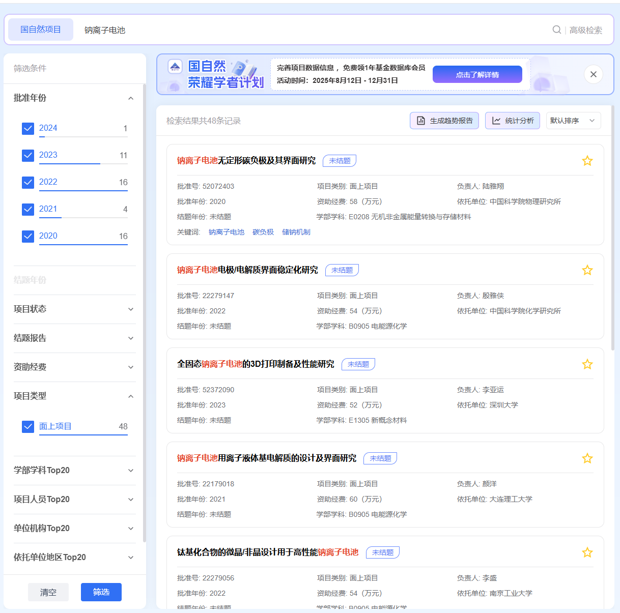 操作: 打开MedPeer「自然科学基金数据库」,输入你的关键词(比如“钠离子电池”)。