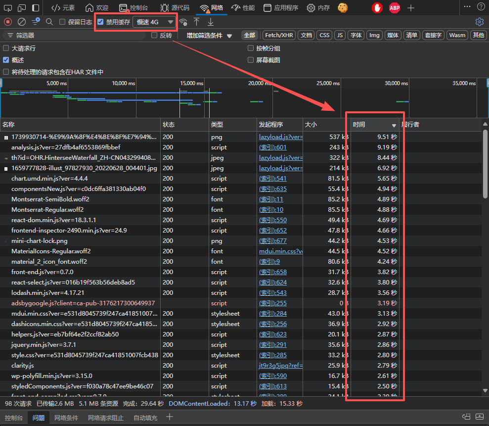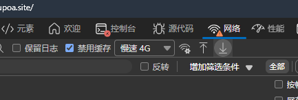 以我的网站为例子,打开开发者工具,在网络选项卡中选中禁用缓存和慢速4G开关,以模拟在Playwright首次访问网站和网站加载过慢的情况。
