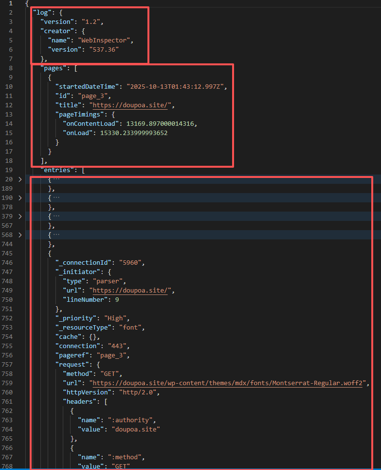 打开文件后可以看到这实际就是一个JSON文件,分为三个结构,log存储日志版本、创建者的相关信息,pages存储所访问网页的域名以及整体网站的加载时间。剩下的entries就是实际请求资源的基本信息。