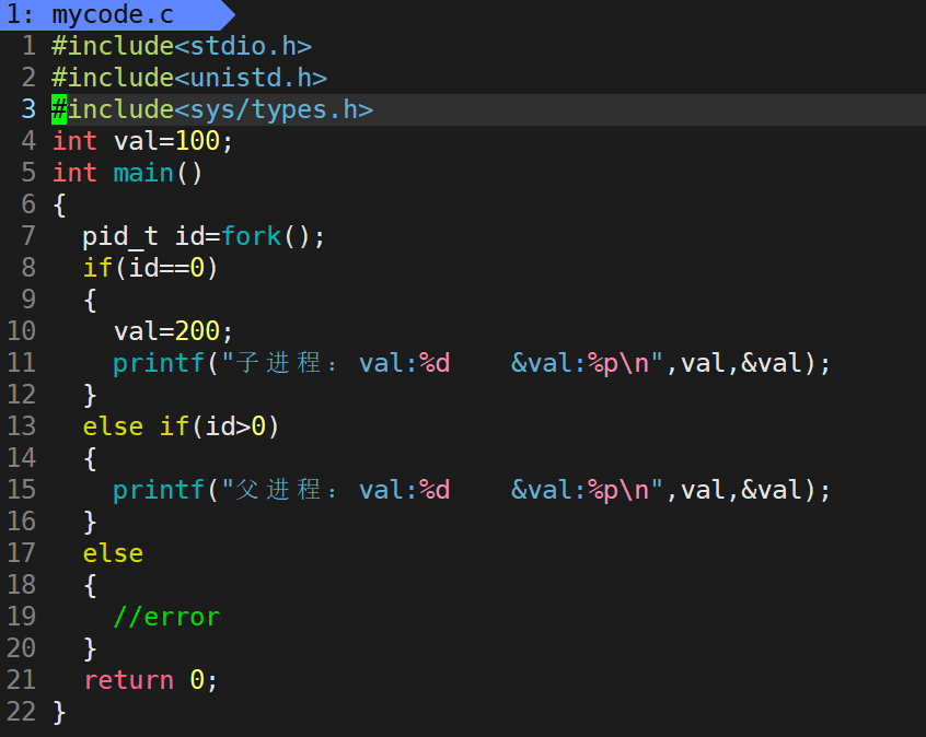 当进程调用fork之后,就会有二进制代码完全相同的两个进程。而且他们都运行到相同的地方。但每个进程都可以开始他们自己的旅程,看下面这段代码