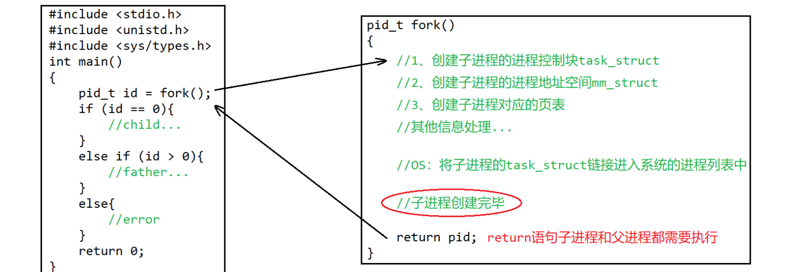 fork函数内部执行retrun之前,子进程就已经创建完毕了,所以return这个语句,父进程和子进程都会执行一次,这就是为啥会有两个返回值。