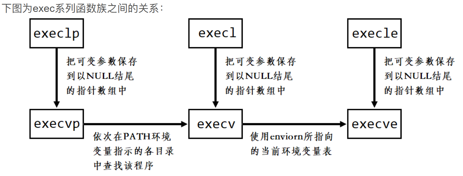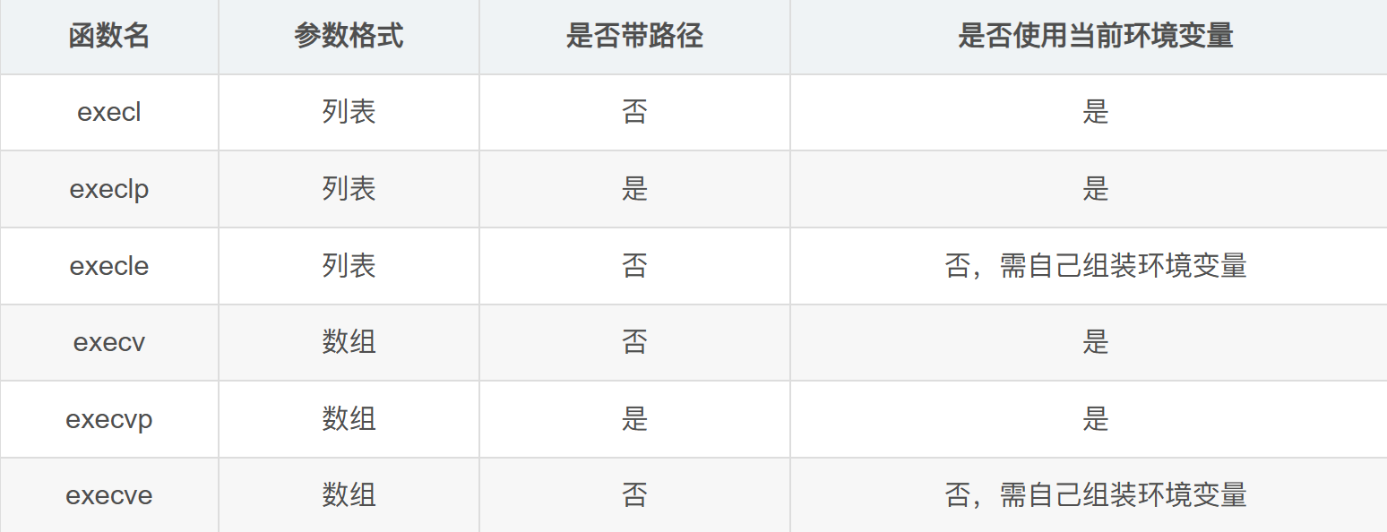 # include <unistd.h>int execl ( const char *path, const char *arg, ...);int execlp ( const char *file, const char *arg, ...);int execle ( const char *path, const char *arg, ..., char * const envp[]);int execv ( const char *path, char * const argv[]);int execvp ( const char *file, char * const argv[]);int execve ( const char *path, char * const argv[], char * const envp[]);