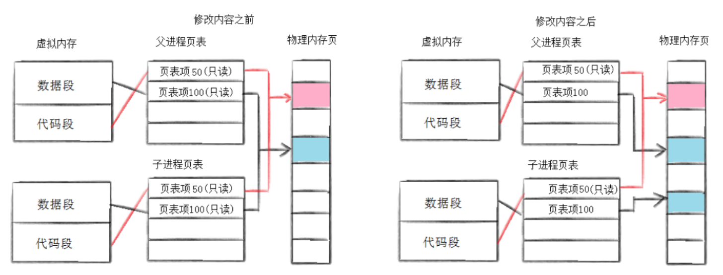 通常,父子代码共享,父子在不写入时,数据也是共享的。当任意一方试图写入,就会以写时拷贝的方式拷贝一份副本然后进行修改。具体见下图