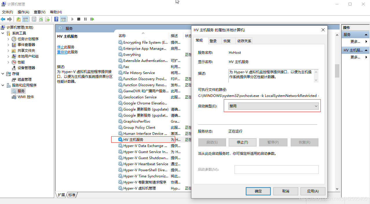 接着打开本电脑-》管理-》服务和应用程序-》服务下找到如下图的HV 主机服务,双击选择禁用。