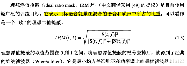 理想二值掩蔽:理想二值掩蔽是最早使用的训练目标,在一个时频单元里,如果局部信噪比(signal-to-noiseratio,SNR)超过一个阈值,理想二值掩蔽在这个单元是1,否则是0。理想二值掩蔽里面的非零值标注出了目标语音主导的时频单元。