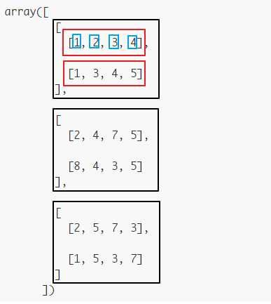 这个shape(用tuple表示)可以理解为在每个轴(axis)上的size,也即占有的长度(length)。为了更进一步理解,我们可以暂时把多个axes想象成多层layers。axis=0表示第一层(下图黑色框框),该层数组的size为3,对应轴上的元素length = 3;axis=1表示第二层(下图红色框框),该层数组的size为2,对应轴上的元素length = 2;axis=2表示第三层(下图蓝色框框),对应轴上的元素length = 4。