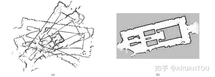 下图就是在一个很大的环境下,(a)表示传感器扫描到的所有地图 (b)表示最终通过算法获取的最终地图