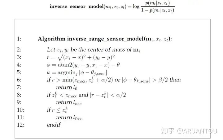 占用网格构图算法,主要是根据t时刻的有噪声的测量数据和机器人当前的位姿来生成连续地图。如下:
