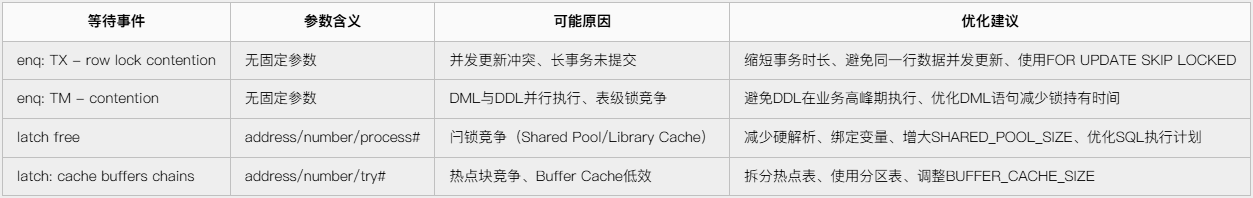 Enqueue:队列锁等待,用于保护共享资源(如表、行数据),常见类型包括TX(行级锁)、TM(表级锁)、ST(空间事务锁)。TX锁等待多由并发更新冲突导致,TM锁等待可能是DDL与DML并行执行引发。