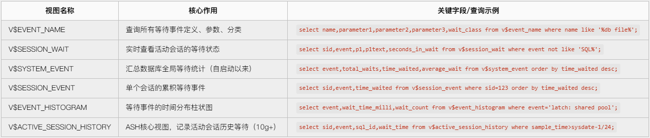 等待事件的诊断依赖一系列动态性能视图,核心视图及作用如下:
