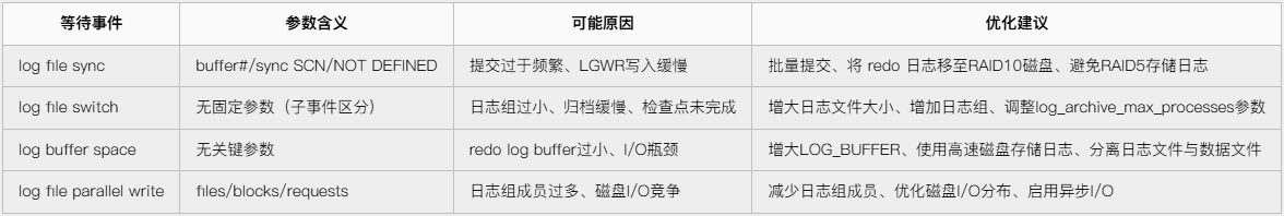 log file switch:日志切换等待,分为“归档未完成”和“检查点未完成”子类。优化方向:增大日志文件大小、增加日志组、提升归档进程效率。