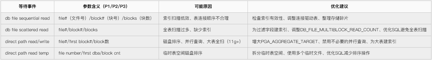 direct path read/write:直接路径读写,绕过SGA直接访问PGA或磁盘,常见于磁盘排序、并行查询。OLTP系统中频繁出现可能意味着排序过度,需增大