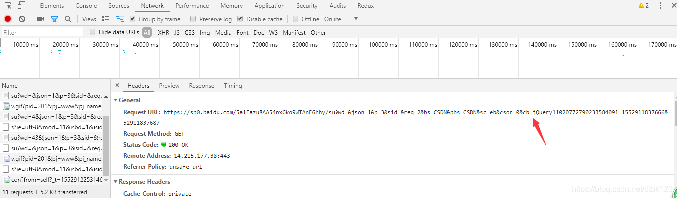 接着打开控制台的Network,便可看到如上图所示,接着复制Request URL的内容,箭头所指的内容其实就是搜索的函数,即cb=函数名,接着看如下代码