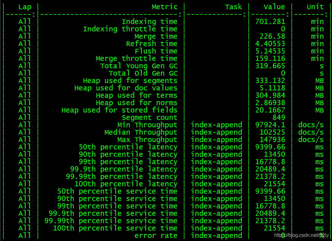 - 从压测结果来看,集群层面的平均写入性能大概在每秒10w+的doc。