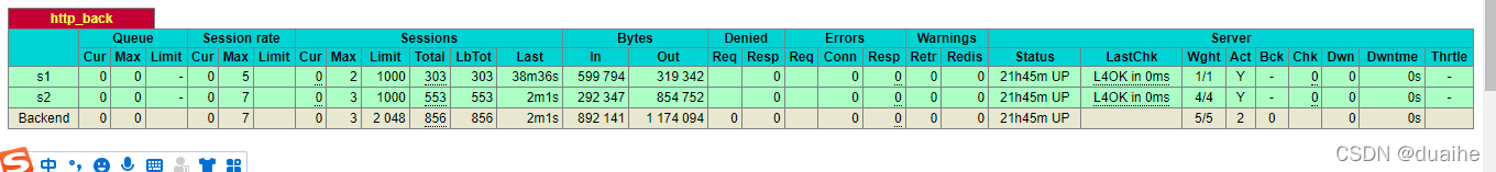 访问192.168.1.2:8099/haproxy-stats 用户名:admin1 密码:admin1234可以看到s1与s2已经可以看到了