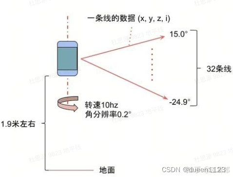 激光雷达&毫米波雷达 Lidar采样率一定,因此帧率越高,角分辨率越低;反之帧率越低,角分辨率越高。角分辨率:点云图像中相邻两个点之间的夹角(应该是同一个激光束扫描得到的)采样率:激光雷达每秒进行有效采集的此书,也就是1s内产生的点云数量。扫描频率/帧率:是转速的意思,10Hz就是1s转10圈。分辨率(激光光束夹角越小分辨率越高,0.1度)通过发射接受信号的频率差,计算目标距离和速度。反射率(一般探测10%以上反射率的目标)线数(32/64/128)探测距离:0.3-200m。