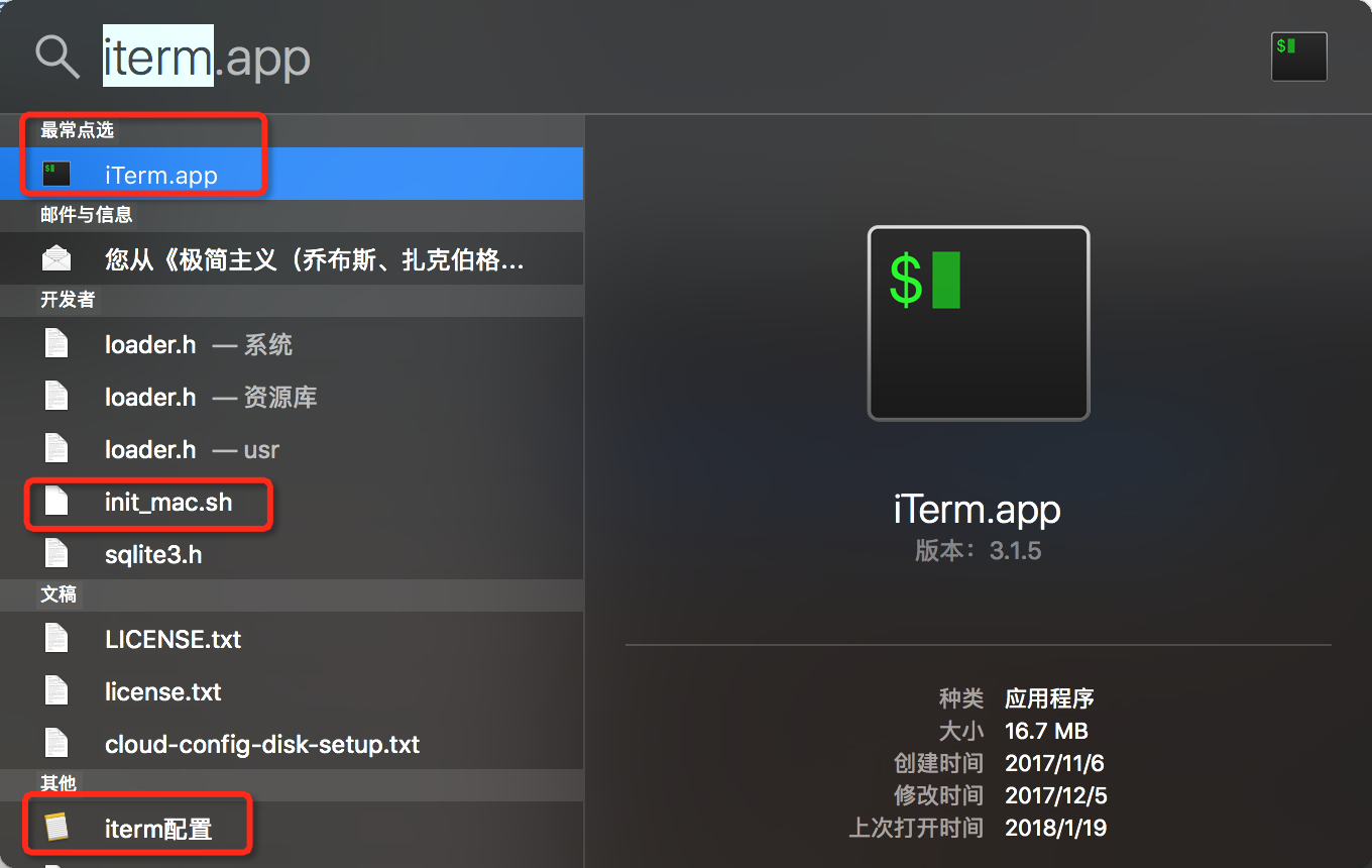 可以看到当我在spotlight输入iterm,它会自动将和iterm相关的任何”文件”都一一列出,并且是智能的(ITerm.app是最常点选)