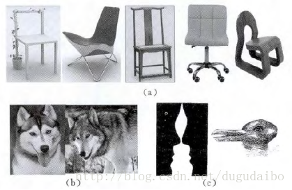(2) 类别层次。困难与挑战通常来自3个方面,首先是类内差大,也即属于同一类的物体表观特征差别比较大,其原因有前面提到的各种实例层次的变化,但这里更强调的是类内不同实例的差别,例如图2 (a) 所示,同样是椅子,外观却是千差万别,而从语义上来讲,具有“坐”的功能的器具都可以称为椅子;其次是类间模糊性,即不同类的物体实例具有一定的相似性,如图2 (b)所示,左边的是一只狼,右边的是一只哈士奇,但我们从外观上却很难分开二者;再次是背景的干扰,在实际场景下,物体不可能出现在一个非常干净的背景下,往往相反,背景可能是非常复杂的、对我们感兴趣的物体存在干扰的,这使得识别问题的难度大大增加。