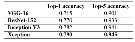 表1。在ImageNet(单作物、单模型)上的分类性能比较。VGG-16和ResNet-152号码仅作为提醒。被基准测试的Inception V3版本不包括辅助塔。