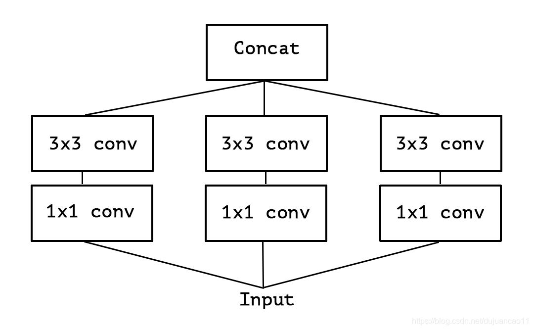 Inception模块背后的想法是通过明确地将其分解为一系列操作,独立地查看跨通道关联和空间关联,从而使这个过程更简单、更高效。更准确地说,典型的Inception模块首先着眼于跨渠道的相关性通过一组1 x1旋转,将输入数据映射到3或4单独的空间小于原始输入空间,然后地图所有这些较小的3 d空间的相关性,通过定期3 x3或5 x5的隆起。如图1所示。实际上,《盗梦空间》背后的基本假设是,交叉通道相关性和空间相关性是完全解耦的,所以最好不要共同映射它们。